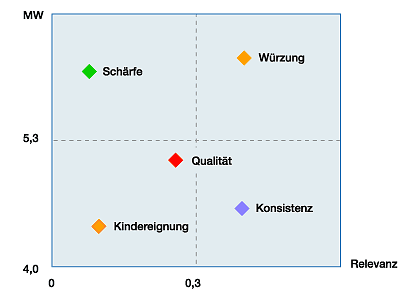 Fazit: Für die Geschmacksbeurteilung sind Würzung und Kosistenz sehr wichtig. Die Konsistenz kann jedoch nicht zufriedenstellen. Das Produkt wird zwar als „scharf” bezeichnet, dies ist jedoch nicht relevant. |